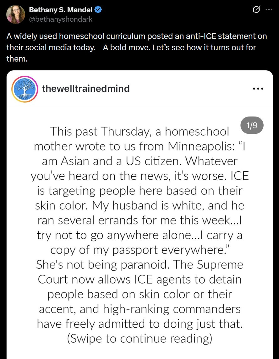 If you don’t know much about “curriculum wars” in classical schools and communities, this will sound strange. But strange as it might be, educators, parents, and more are fiercely devoted to the producers of classical curriculum. That’s why Susan Wise Bauer’s recent activity on X (and elsewhere) has been something of a shock for many. Since Classical Education practitioners are hyper-committed to their curriculum of choice, SWB’s comments caused something of cognitive dissonance for many (though there were plenty of “I said this X years ago” to go around). But I’d wager this will actually become a larger Cultural-Political argument within CE, with the curriculum’s content becoming almost irrelevant. More and more teachers, parents, etc. will allow current political views to override the fundamental position of a Classical Education, namely that the reading of old books, following the old paths, is the most important aspect of learning. The curriculum that says “the right thing” in the “right now” will be the texts that schools and co-ops turn to for structure. And I don’t think is a good thing.